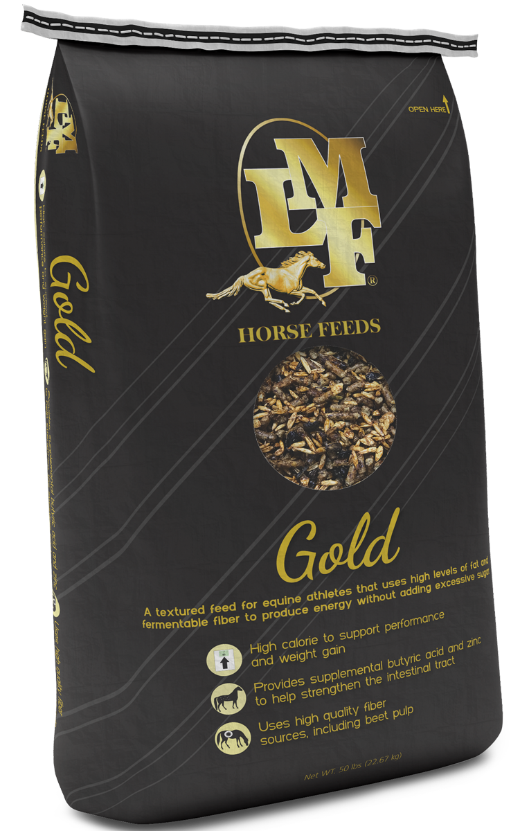 LMF Gold is a nutritionally advanced textured feed for athletic horses. Gold contains 12% fat, originating from ground flax, sunflower seeds, vegetable oil, rice bran and prilled vegetable fat. The combination of fat sources ensures a favorable ratio of Omega 3 to Omega 6 fatty acids. These fatty acids are essential for energy production, immune function and healthy skin and hair. Gold also contains fermentable fiber from shredded beet pulp and soybean seed coats. These fiber sources produce energy but do not add excessive amounts of sugar to the diet. The combination of fat and fiber aids in keeping performance horses focused. LMF Gold also uses value added ingredients including yeast culture to maintain proper digestive function, high levels of antioxidant vitamins to maintain muscle function and chelated trace minerals to ensure healthy bones.