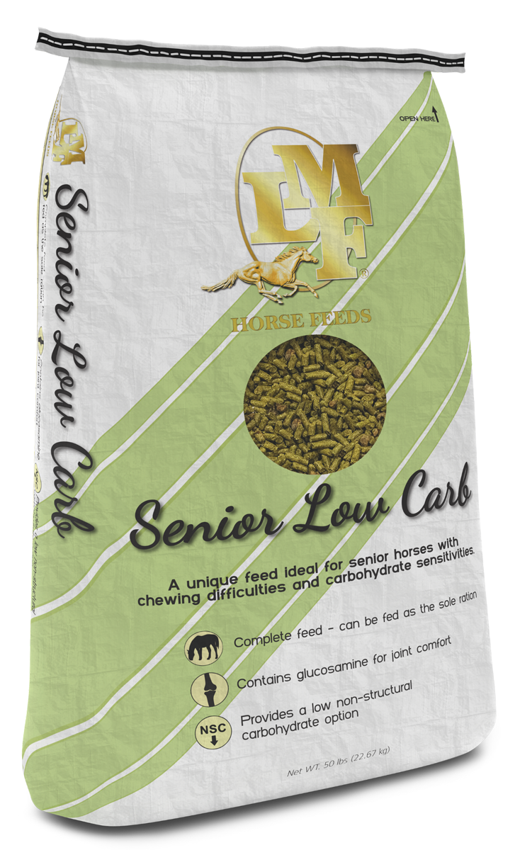A low‑carb complete feed for senior horses with chewing and metabolic challenges; features, no grain or molasses, joint support, digestive aids, and balanced nutrition in a highly palatable pellet.